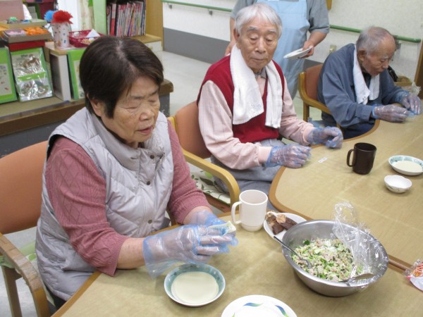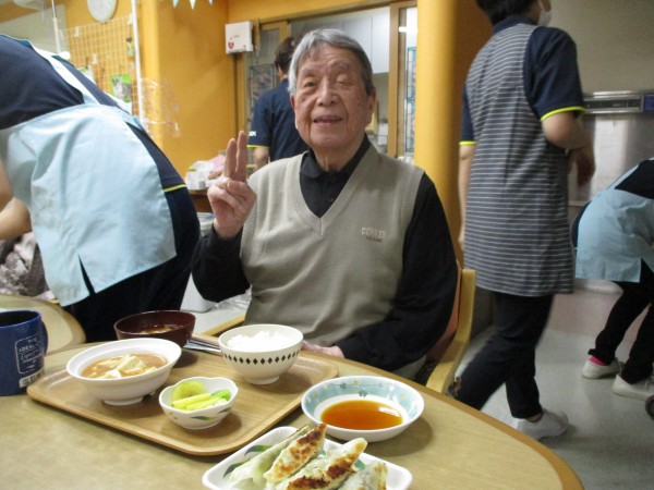 先日、母の日のお祝いレクとして入居者様たちと一緒に餃子を作りました!