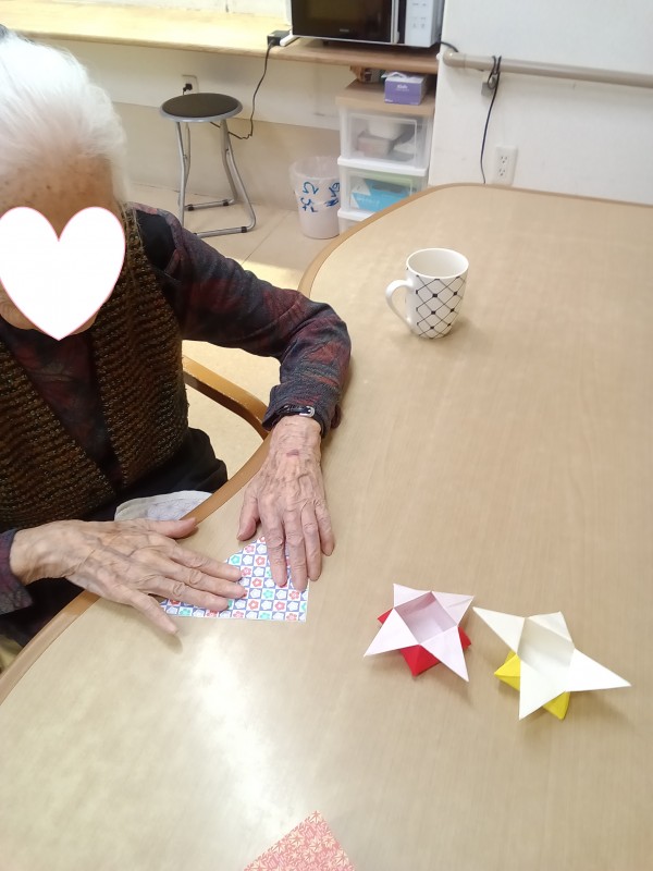 おやつ入れを「どうしようか?」と考えた末にご利用者様と折り紙で