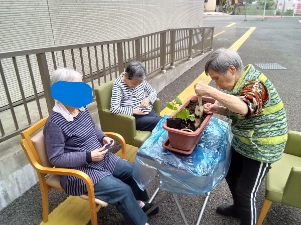 去年のアサガオ・トマトに続き、今年はご利用者様とゴーヤの苗を植えました。