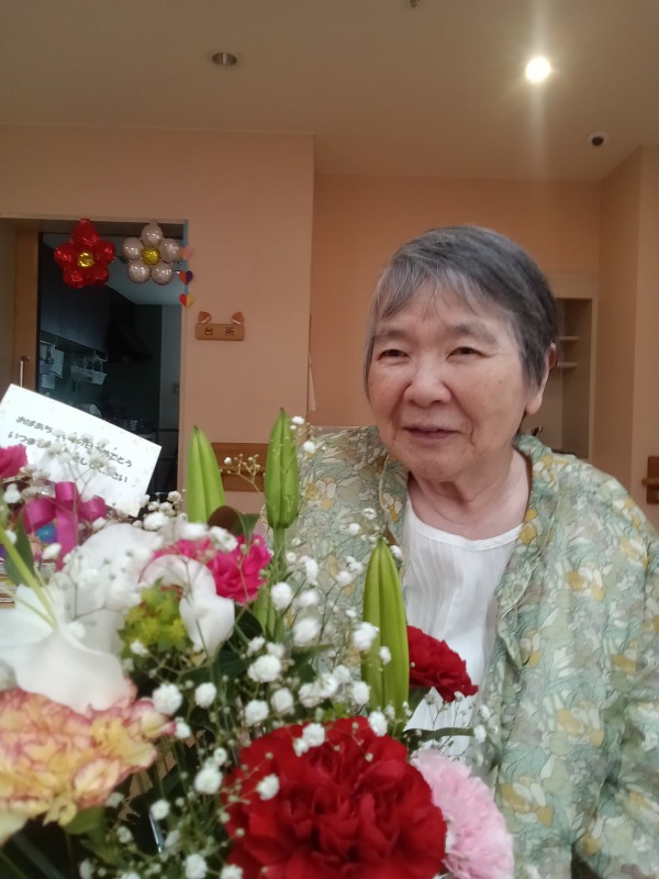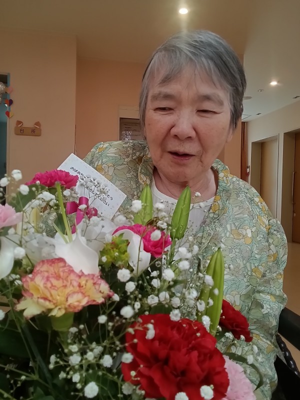幸せそうに微笑まれるお母様(n*´ω`*n)カーネーションをご覧になられお母様もご家族様を思い出されていたと思います(#^.^#)