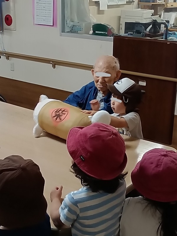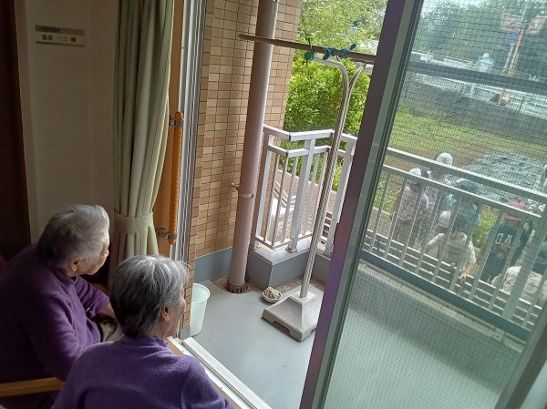 園庭のさつまいもの苗に水やりを行って頂き、各階へ慰問に来て頂けました。