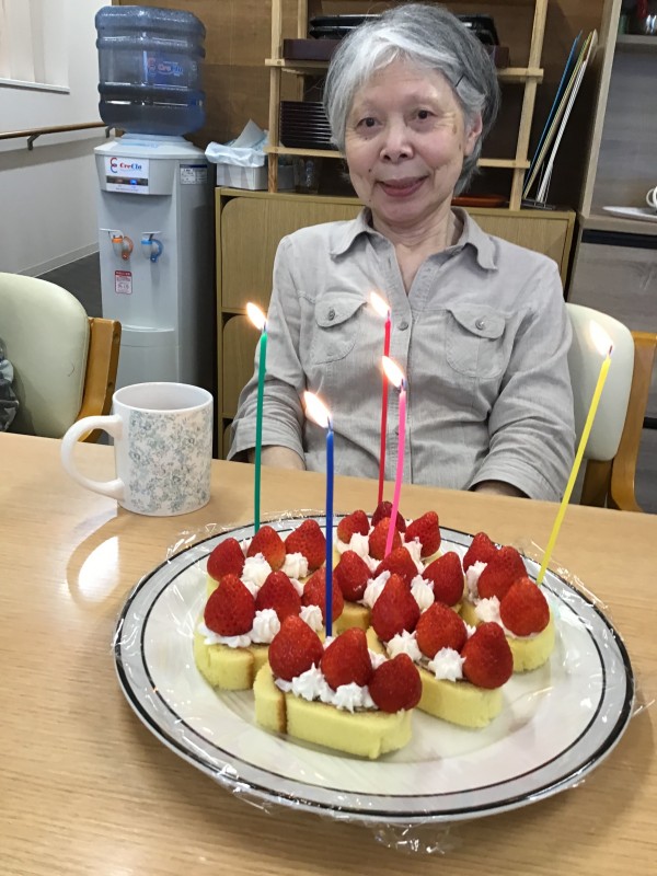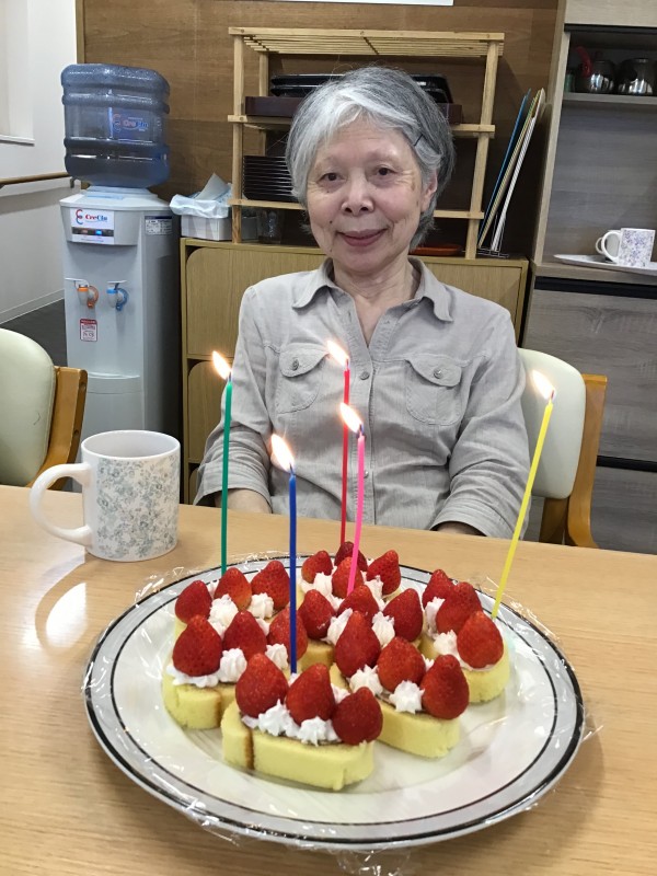 (美味しいケーキを食べて、皆さんに祝ってもらえて幸せです。)