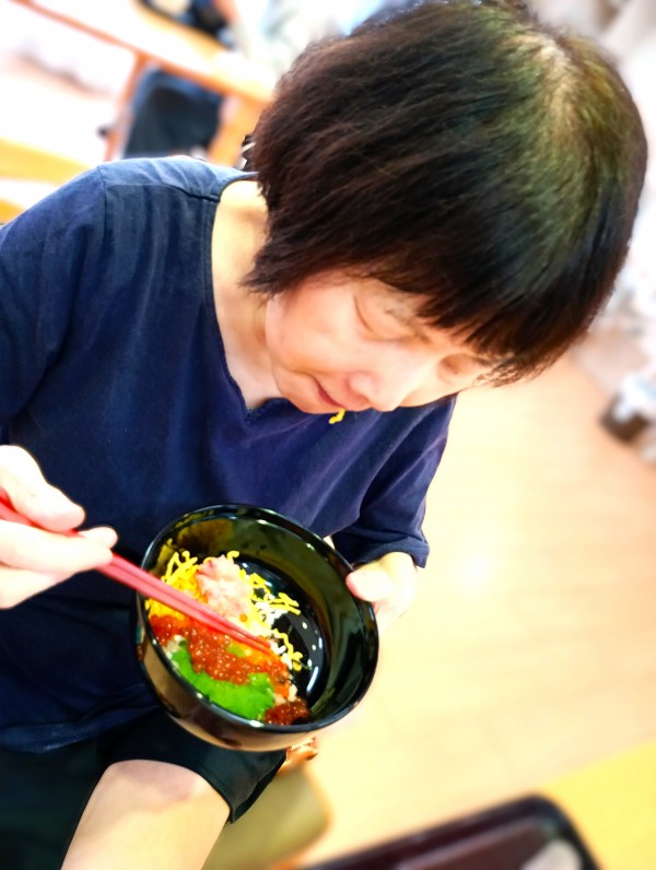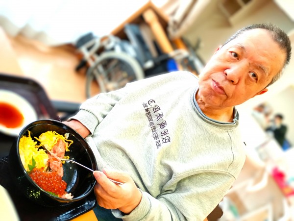 ★☆三橋6丁目の昼食•海鮮丼!!春二色丼♬イベント食‼②階♬鈴木勝也ホーム長!舌鼓大絶賛2025年令和7年✨ 『みんなの家 三橋6丁目 介護ブログ』☆★
