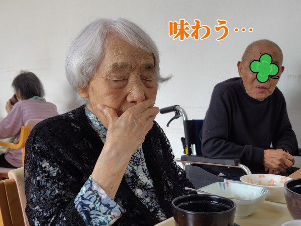 よ〜く味わって召し上がっている105才様。手を口元に持っていくのは、美味しい鉄板ポーズ!