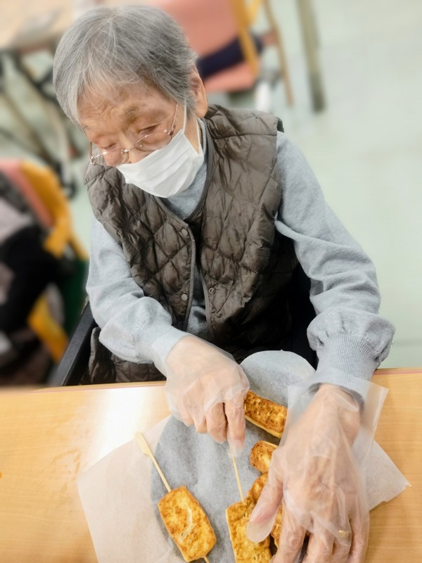 事前に職員が水抜きをした木綿豆腐とこんにゃくを1.5㎝位の幅で切って頂き