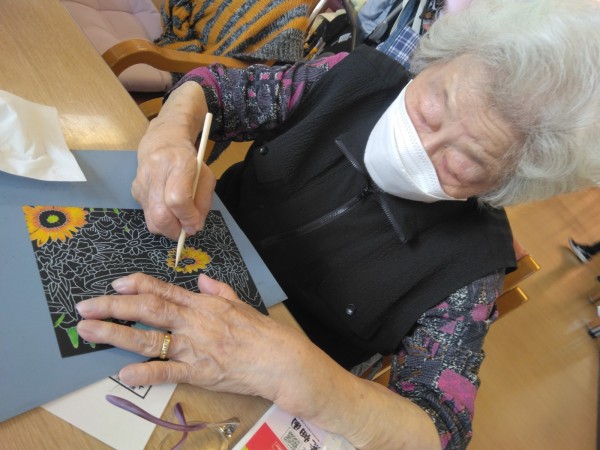 黒い紙を竹串で削っていくと色が出て、絵が出来上がります!