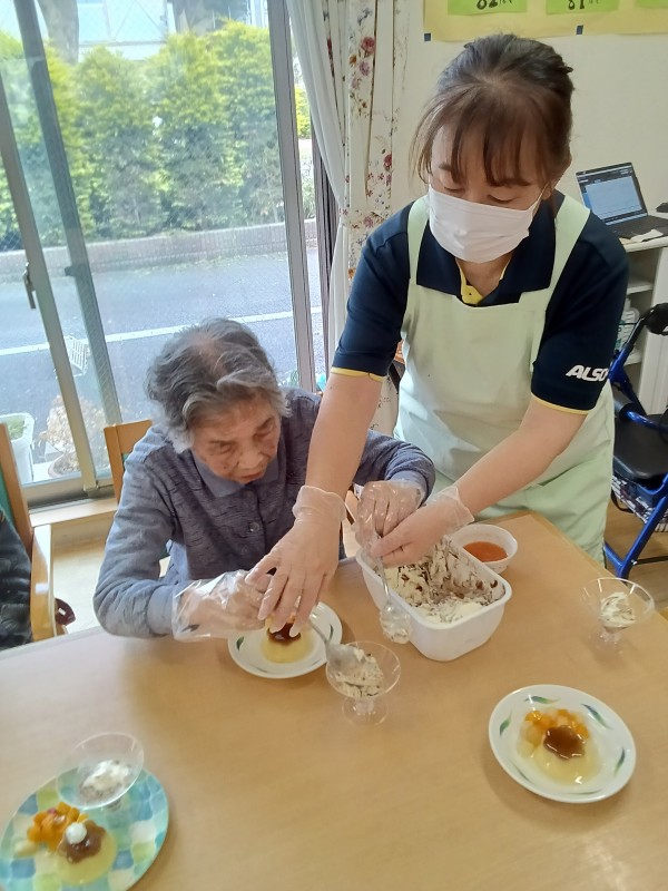 次に、食べたいおやつを皆様にお聞きし、アイスが食べたいとのことで『プリンアラモード』を作りました♡