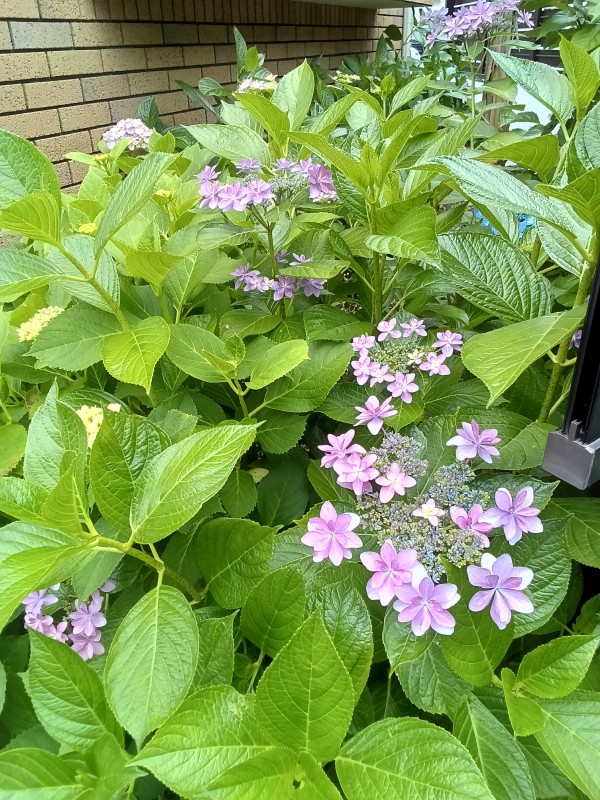 散歩の途中には、ピンクやブルーの紫陽花が咲いていました。