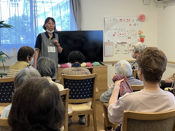 ホーム内で涼んで頂きながら訪問運動教室の岡田先生の登場です♪