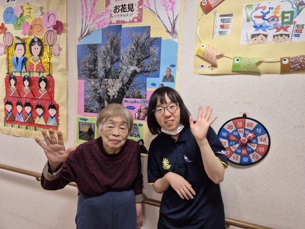 このように、下のちぎり絵は利用者様制作、上の写真は5月の様子がふりかえられるように、掲示されていました。(*^▽^*)
