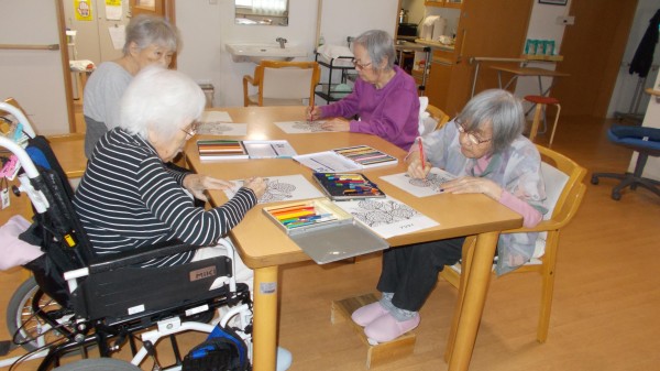 以前は何でもなかった色鉛筆の塗り絵も、塗り続けると少し指が痛くなる方もおられましたが、そういう時はクレヨンの出番!