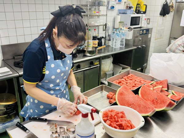 スタッフが厨房に入って下準備を進めています。超特大のスイカからかわいい形を切り出しています。完成を楽しみにしましょうー♪