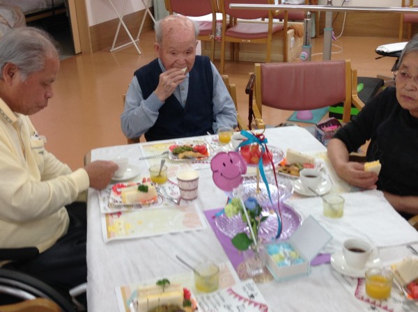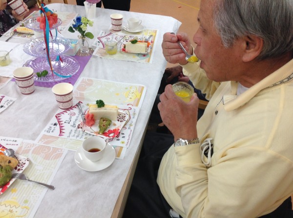完成しましたー♪今回は季節のさくらんぼとスイカを追加してアフタヌーンティーを行いました。『初物75日』という言葉がありますが、初物を食べて寿命が75日伸びたわと喜ばれるご利用者様もいらっしゃいました。