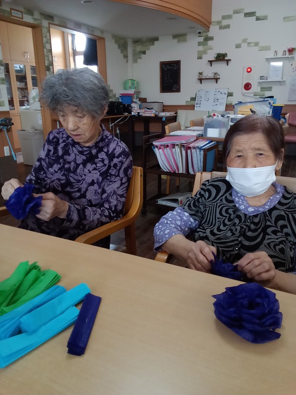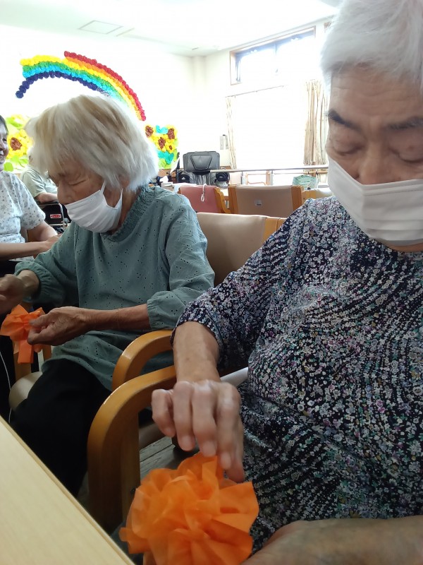 真夏の様な暑さの午後 カラオケの機材で唱歌を流しながら、花紙で花を制作しました。