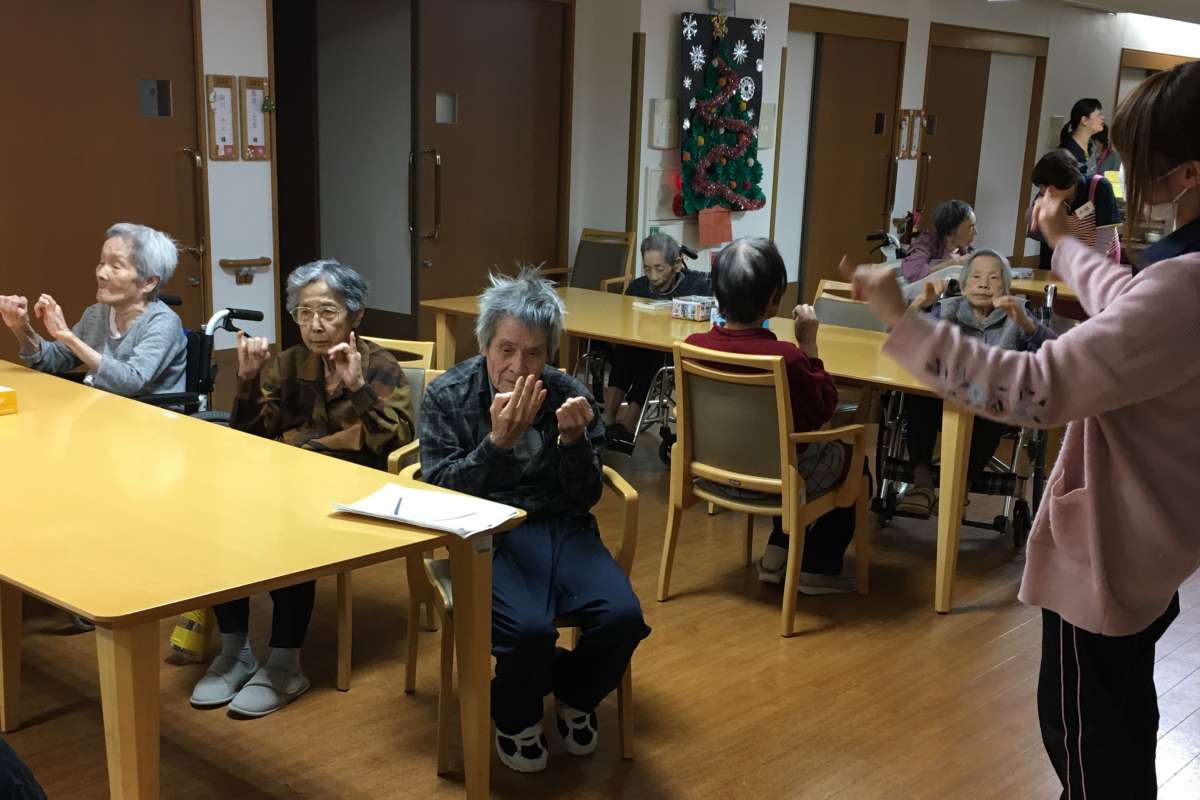 食事前にご飯を美味しく食べましょうと職員が声をかけ体操を行っていました。皆さんいい笑顔で体操をしていました( ◠‿◠ )