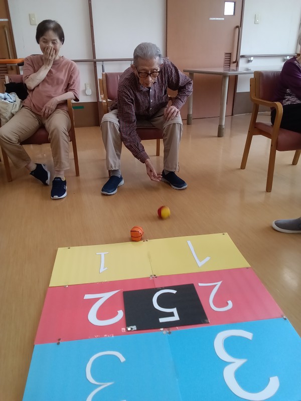 3球ボールを投げ、止まったところの得点が高い方が勝ちです。