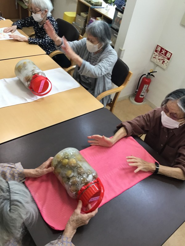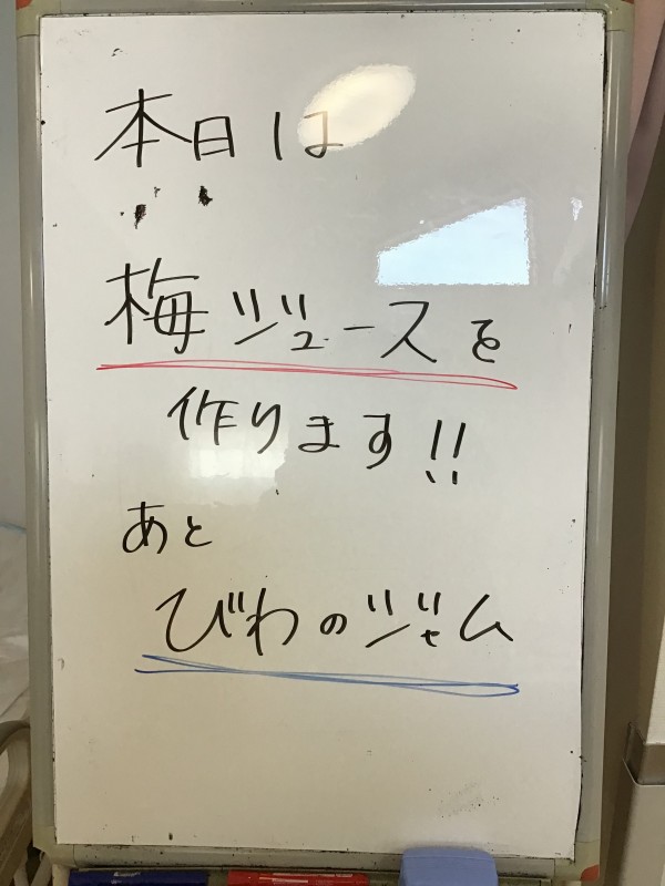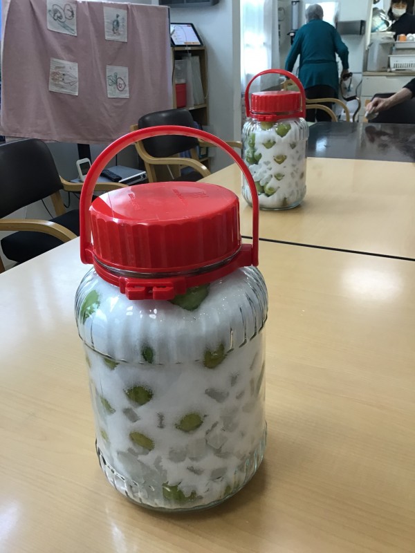 梅ジュースにするにはまだ青い梅がいいようで、いただいてから数日経ったら甘い香りがしてきたので、ご利用者様に急いで漬けていただきました!