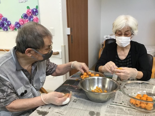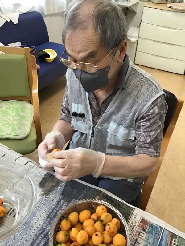 ご利用者様のご自宅に実ったびわをいただいたので、皮をむいて種を取っていただきました。