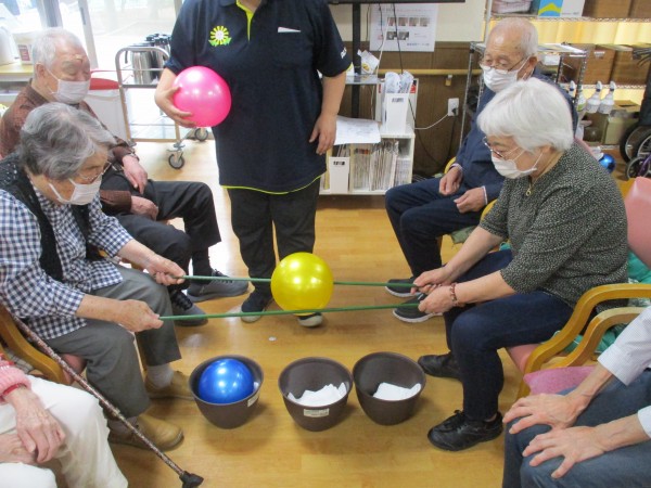 「せーの!」と声を掛け合う様子や、ボールがうまく入った時の拍手と歓声に、フロア全体がとても和やかな雰囲気に包まれました。「これは意外と難しいね」「たのしい!」と、皆様夢中で取り組まれていらっしゃいました。今後も、楽しく取り組めて、自然と身体も心も元気になるレクリエーションを続けてまいります、どうぞお楽しみに♪