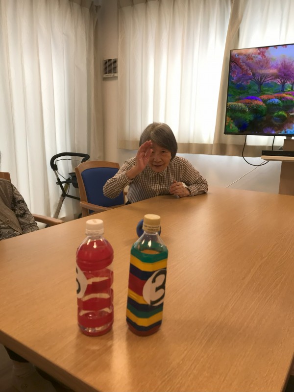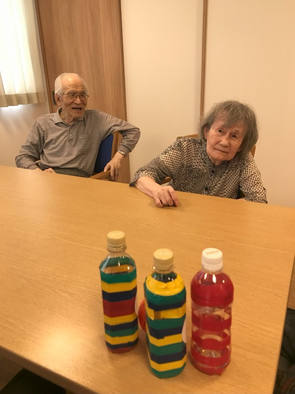 先日、2階では手作りのペットボトルボーリング大会を開催しました。ペットボトルを再利用して、職員が丁寧に手作りしたカラフルなピンを使用。環境にも優しいエコなレクレーションとなりました!