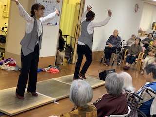 ほとんどのご入居者様が5階に集まり、時には手拍子で、時には手を振りながらタップのリズムに合わせ自身の身体状況にあった身振りをされているのを見ると、人に流れているパーカッショニズムと言うのは年齢・性別・人種等を越えて作用してくる物なのだと改めて感じた次第です