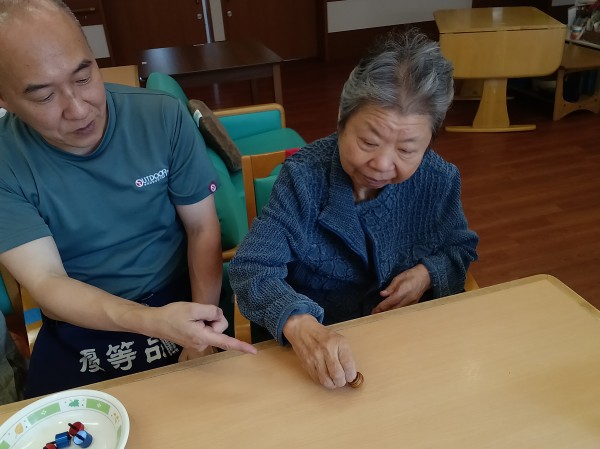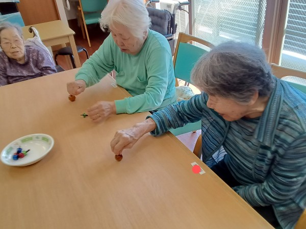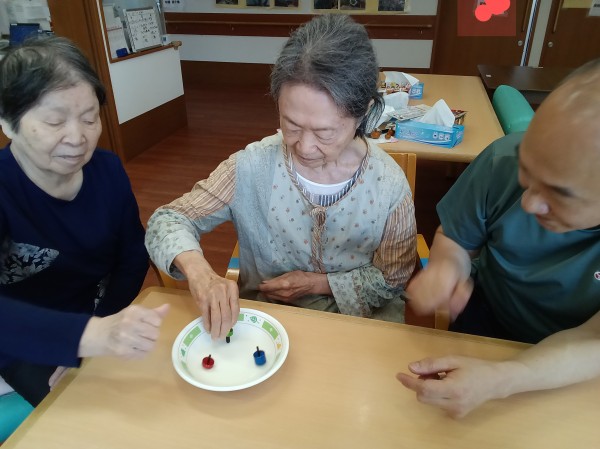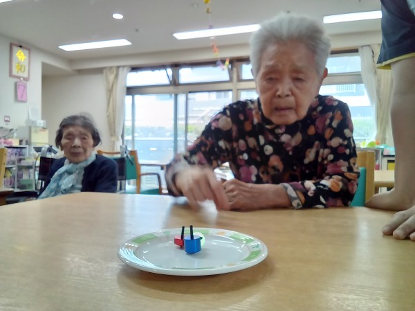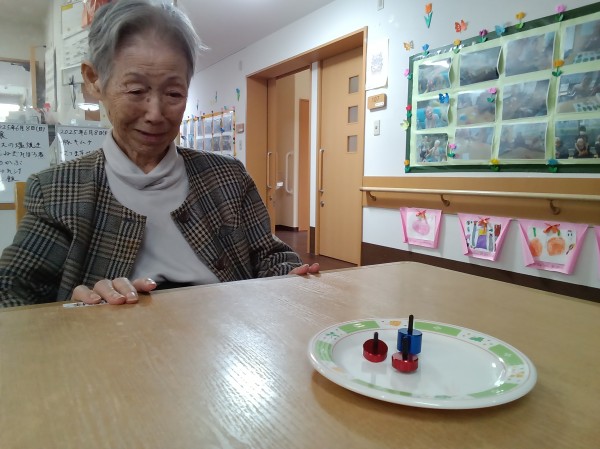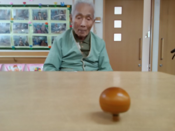昔を思い出しての駒回し、なかなかに難しかったようです。指先を上手に使わないと回らないしね。