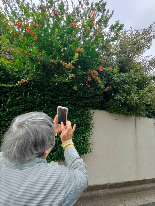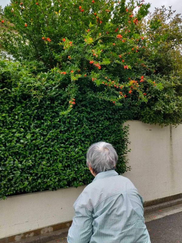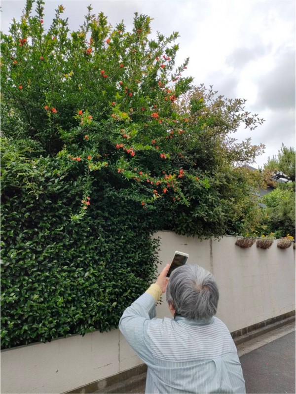 「ザクロの花が珍しいから、写真撮りたくて携帯電話を持ってきたの。」