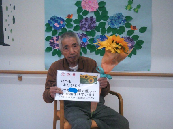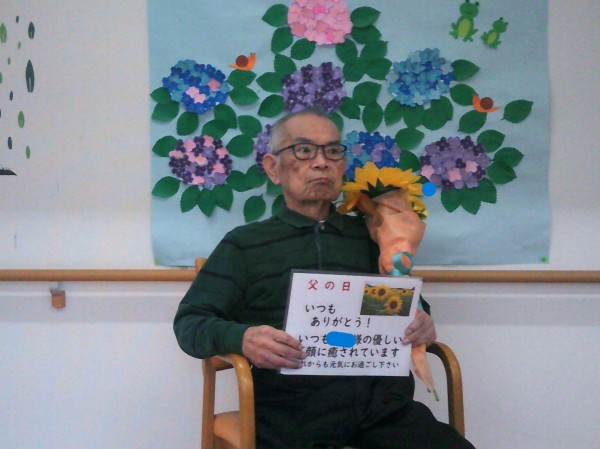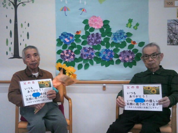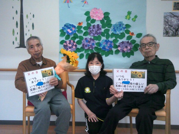 今日は6/15 父の日です。お祝いを行いました!! 2名の男性がおります。花束と感謝状をお渡しをしてお祝いを行いました。