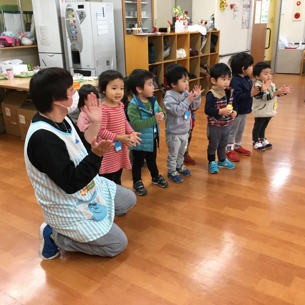 園児交流会もかねてのクリスマス会、ちいさなお友だちからキャーキャーいわれてサンタさんまんざらでもなかったようです。