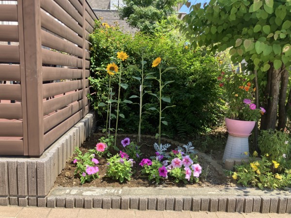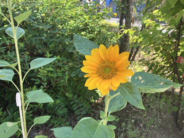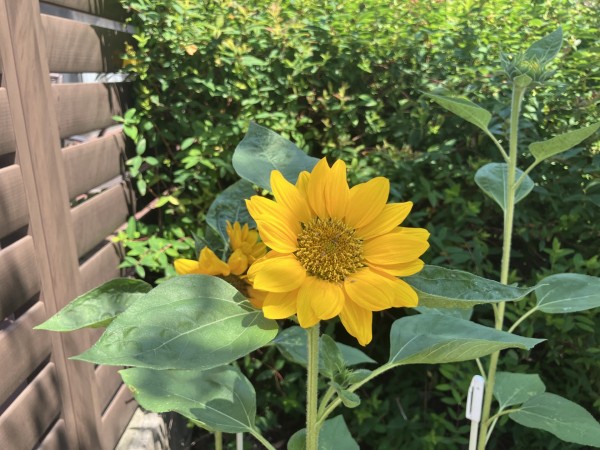 そんな暑さの中、アミカの郷川口正面玄関脇には、ひまわりが凛々しい姿を見せています。