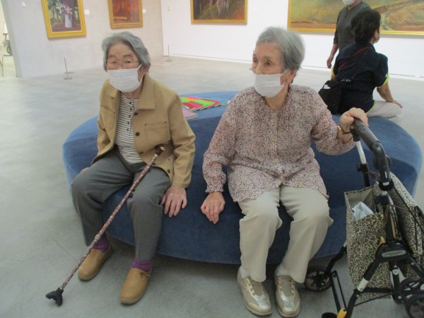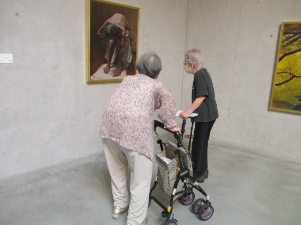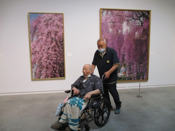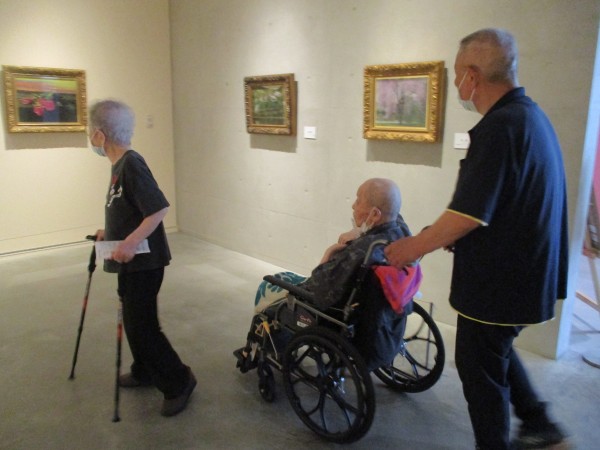 館内には、現代リアリズムの巨匠・三栖右嗣氏の迫力ある絵画が数多く展示されており、その写実的で力強い作品に、皆様じっくりと見入っておられました。「この果物の絵、写真みたい!」「花の絵がとても印象的だった」と感性豊かな感想が飛び交い、会話も弾みました。そして何よりも印象的だったのは、作品を眺めながらカフェで頂くおはぎと飲み物!アートと甘味の贅沢な組み合わせに、「絵を見ながら食べるおはぎなんて初めて」「これは最高ね」と皆様大満足のご様子でした。記念撮影ではお気に入りの作品を背景にパシャリ!帰りの車内でも、「また行きたいね」と嬉しい声が聞かれました。
