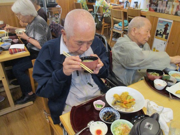 また、久しぶりの外食という男性利用者様もいらっしゃり、ノンアルコールビールで乾杯される姿も♪「外で飲むと、気分が違うな」と、とても喜ばれていらっしゃいました。外での食事は、やはり気分転換にもなり、皆様大満足のご様子でした♪