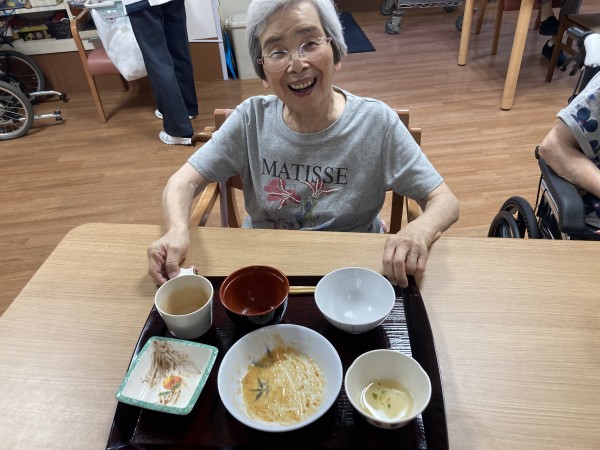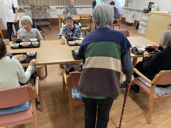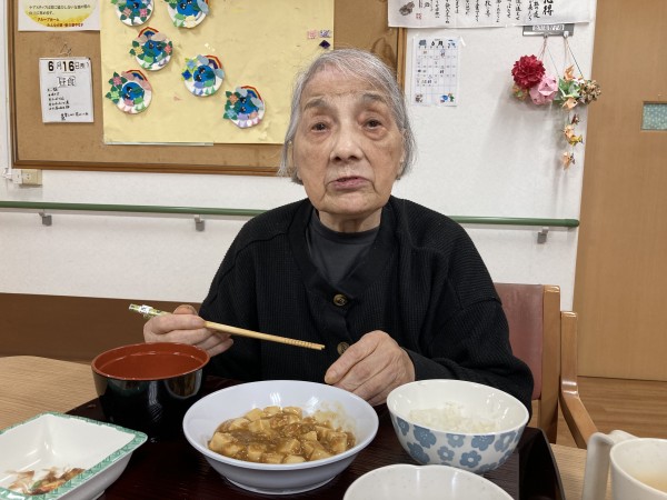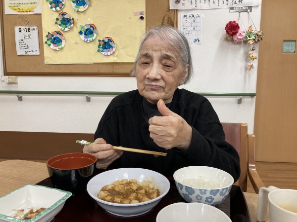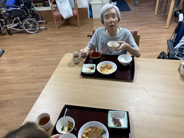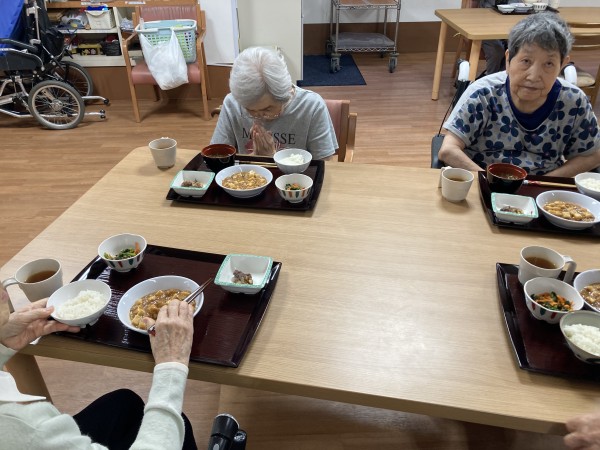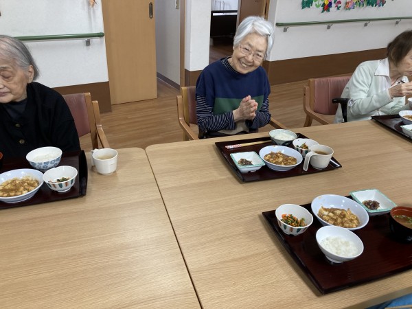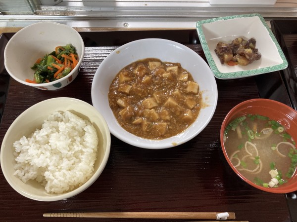 今日のお昼の献立は御飯・味噌汁・マーボー豆腐・さつま芋のいとこ煮・からし菜の和え物です。