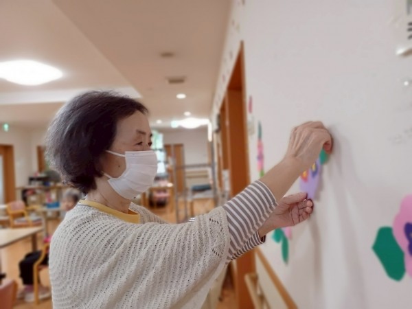 ちょうど、ご利用者様がご自身の居室付近に紫陽花の飾りつけをしていました!
