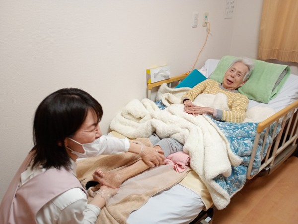 この日も、2名のご利用者様の様子を見させていただきましたが、居室で受けられた方は、終始笑顔で会話されながら施術を楽しまれていました。