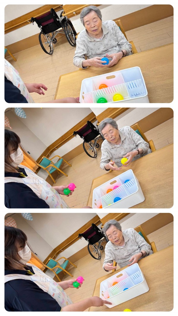 お次は・・カラフルなボールを使って座りながらも楽しめるボール投げを行いました!
