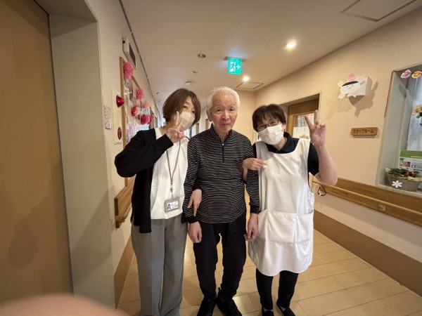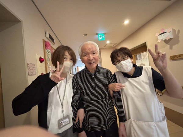 楽しいレクリエーションのお時間を過ごされ職員と記念の1枚✨職員も元気にピースサイン(๑´ڡ`๑)V
