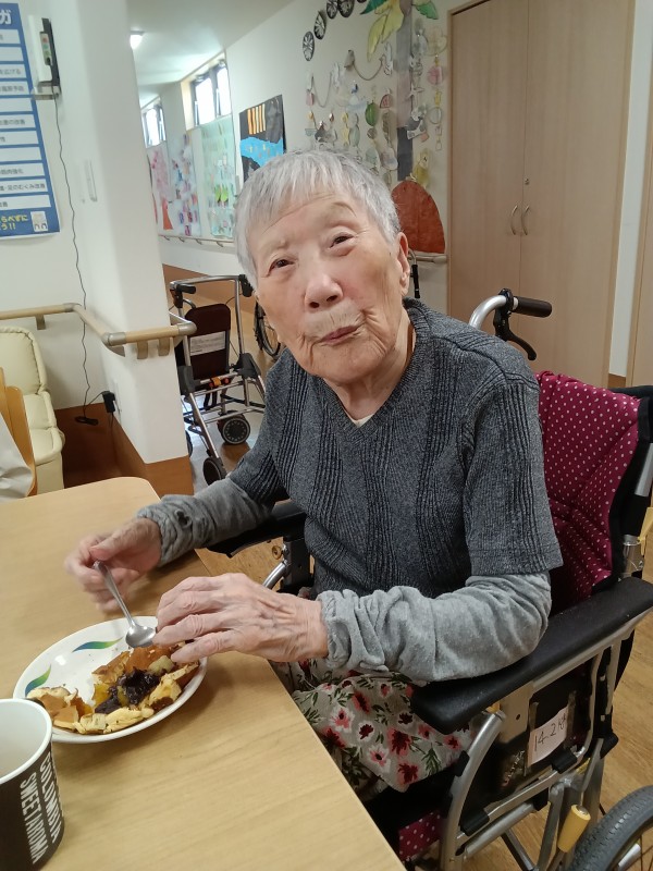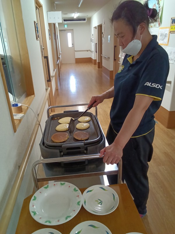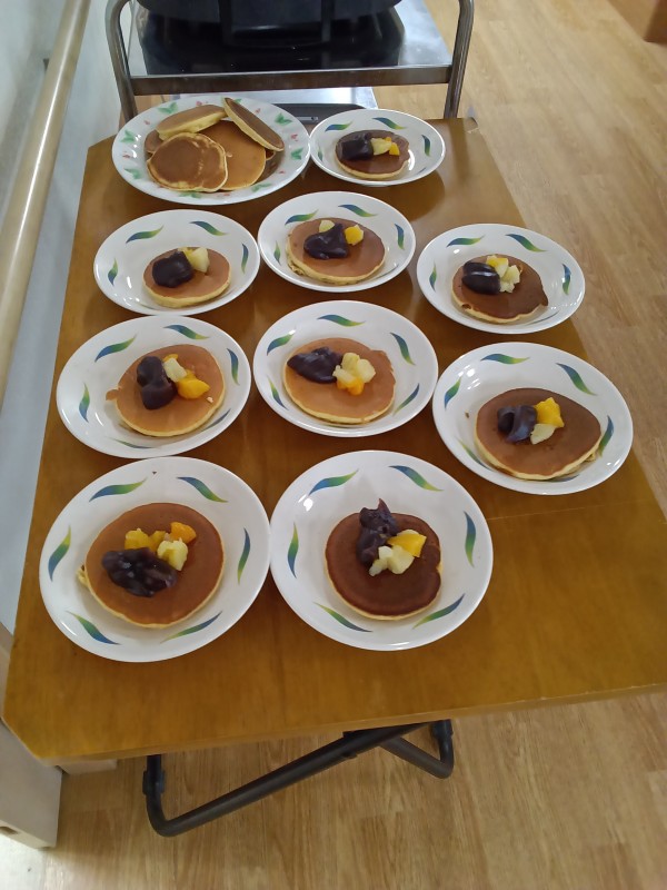 スタッフもおやつのパンケーキ作りに頑張ってますよ。美味しそうに焼けています。「イエーイ‼」