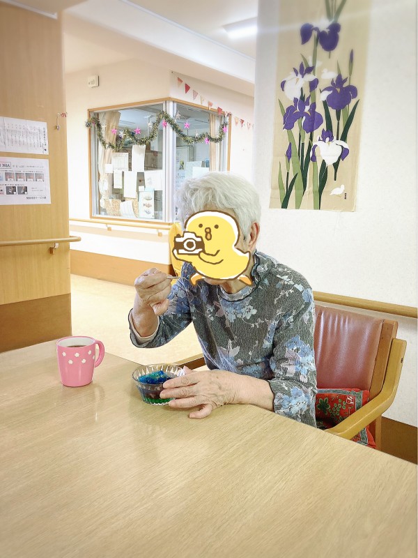 母の日おやつレクに引き続き父の日おやつレクホーム長お手製のアジサイゼリーをいただきました(⌒∇⌒)