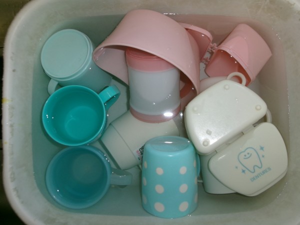 毎週日曜日に、入歯ケース、コップ、ガーグルベースン(うがい受け)