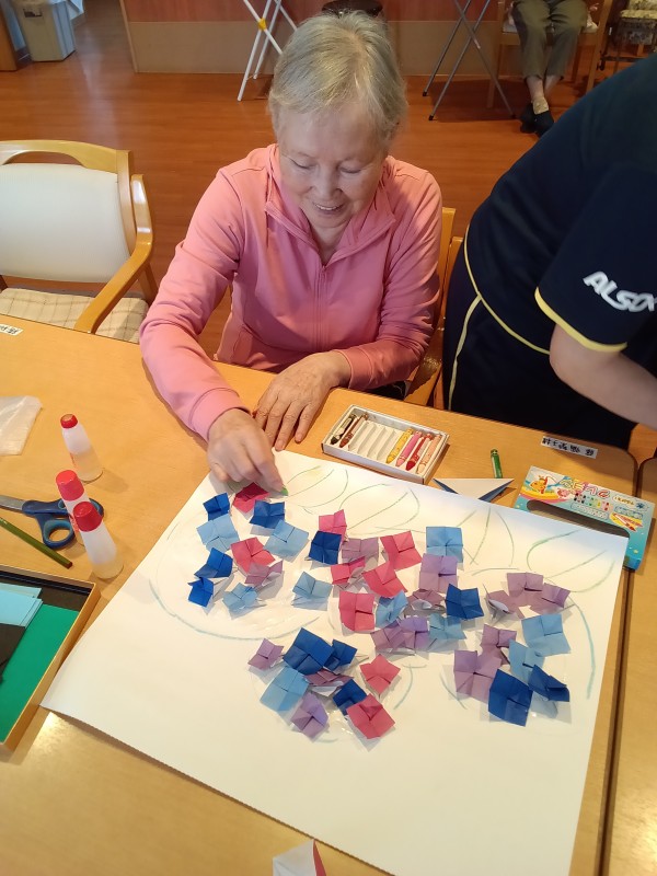 折り紙で、紫陽花の貼り絵を行いました( *´艸`)