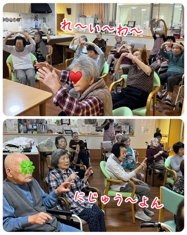「れ~い~わ~」と声を出しながら手で大きな輪を作ります