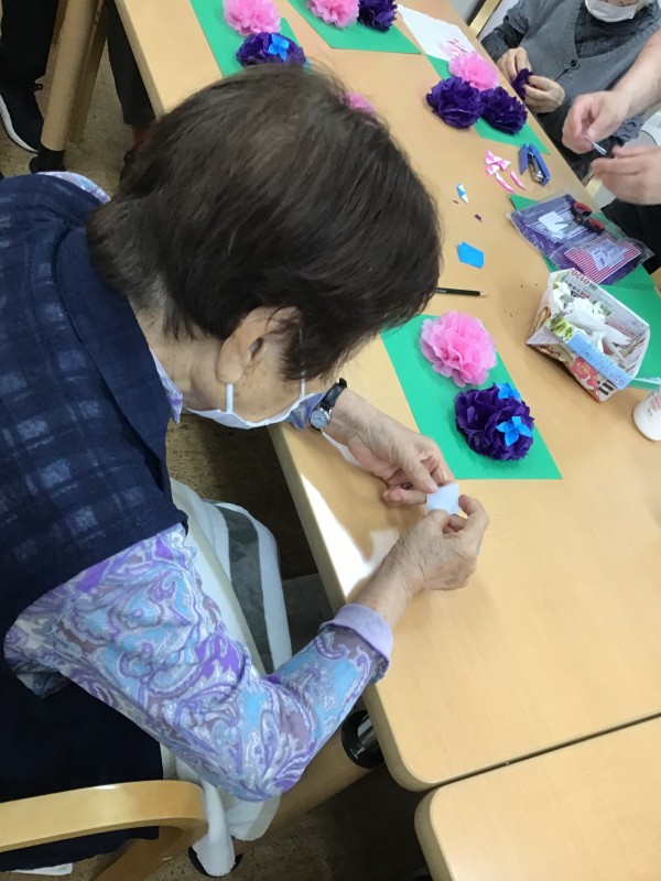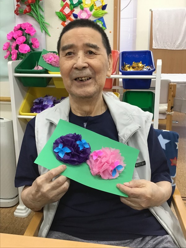 お花紙で作った紫陽花と、折り紙で作った紫陽花を合わせて貼って出来上がり!!