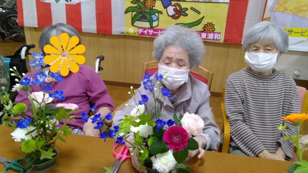 今回は、1Fデイサービスと合同でフラワーアレンジメントを行ないました。