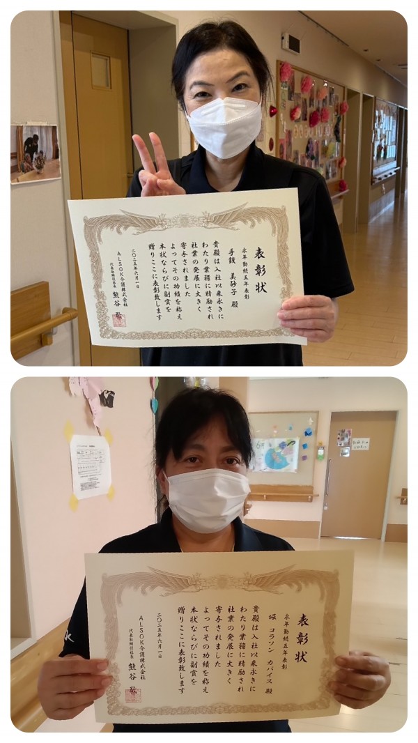 この度「みんなの家・川越寺尾」では、勤続5年の手銭ケアマネージャーと堀職員、そして10年の樋口職員の永年勤続表彰式を行いました!