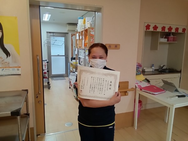 細やかなケアと元気な笑顔で支えてくれる職員に金子ホーム長から表彰状授与致しました!
