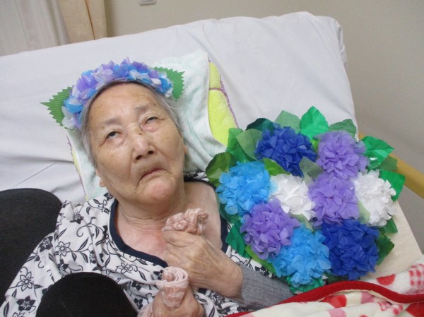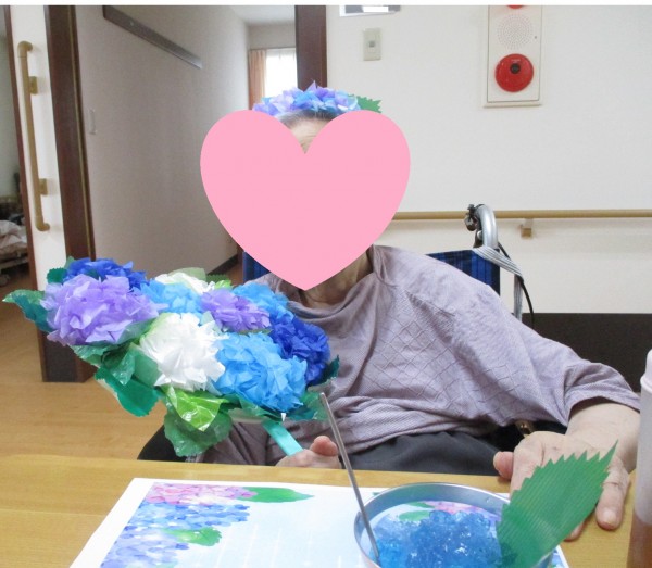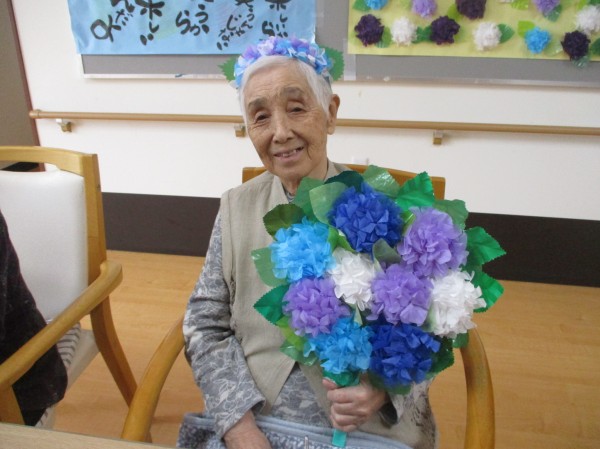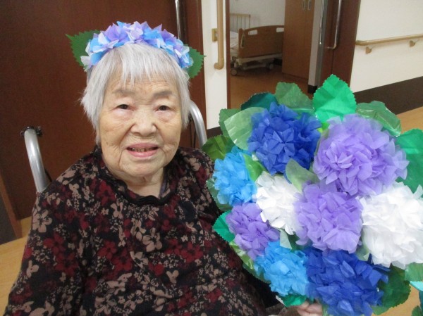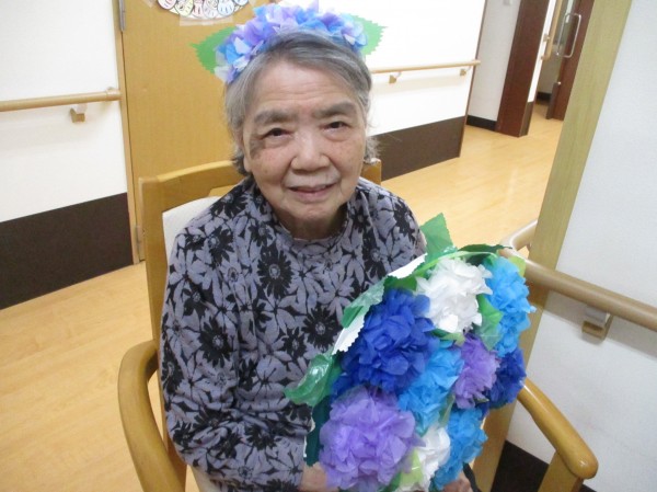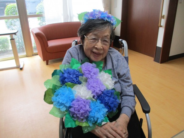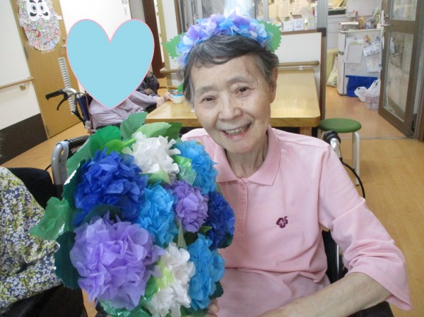 1階の皆様が5月の終わりに作っていたお花紙のアジサイをうちわに貼って、職員手作りのカチューシャもつけて記念写真をとりました♪