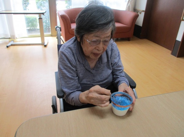 こちらがおやつの写真なのですが、下の層はミルクプリン、その上に水色・青色・紫色のゼリーをクラッシュし、アジサイの様な見た目の、職員の愛情たっぷりプリン&ゼリーです( *´艸`)