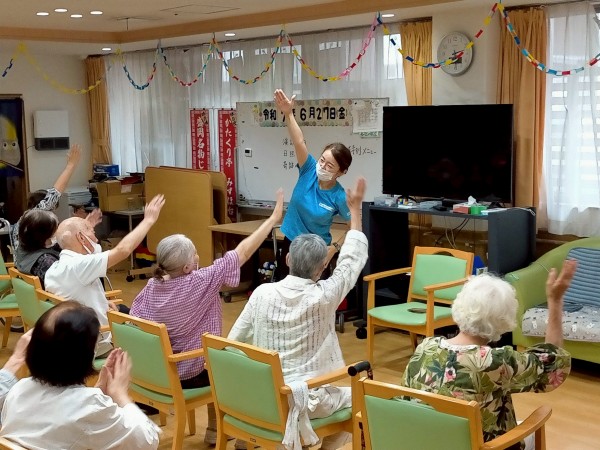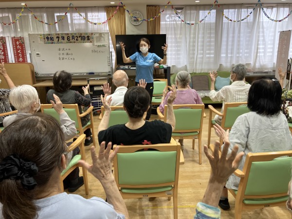 明るい先生の声かけと、リズムに合わせた体操で、笑顔いっぱいの機能訓練。