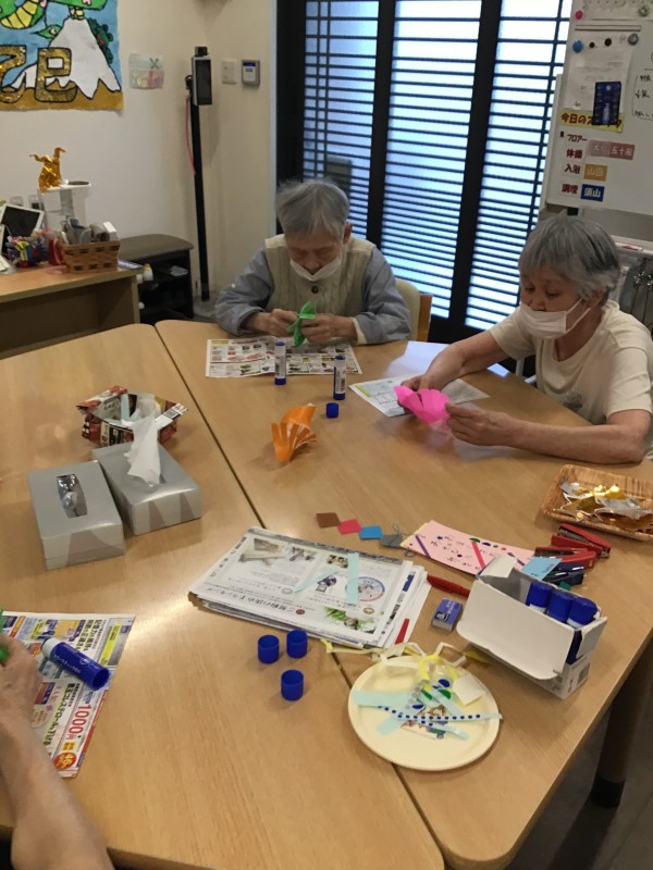 半分に折った紙をすだれ状に切ったりと細かい作業が多いご様子でしたが「難しいわね…」と仰りながらも集中して取り組まれていました。